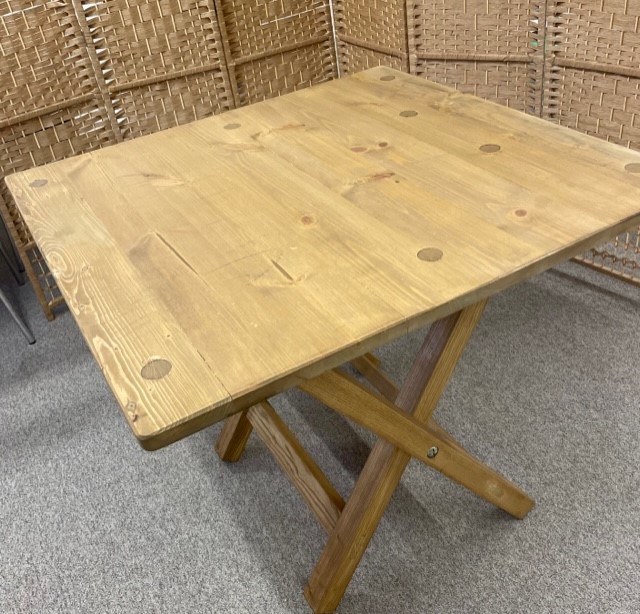 Square rustic table with folding legs for reception drinks, or as a cake table or present table.